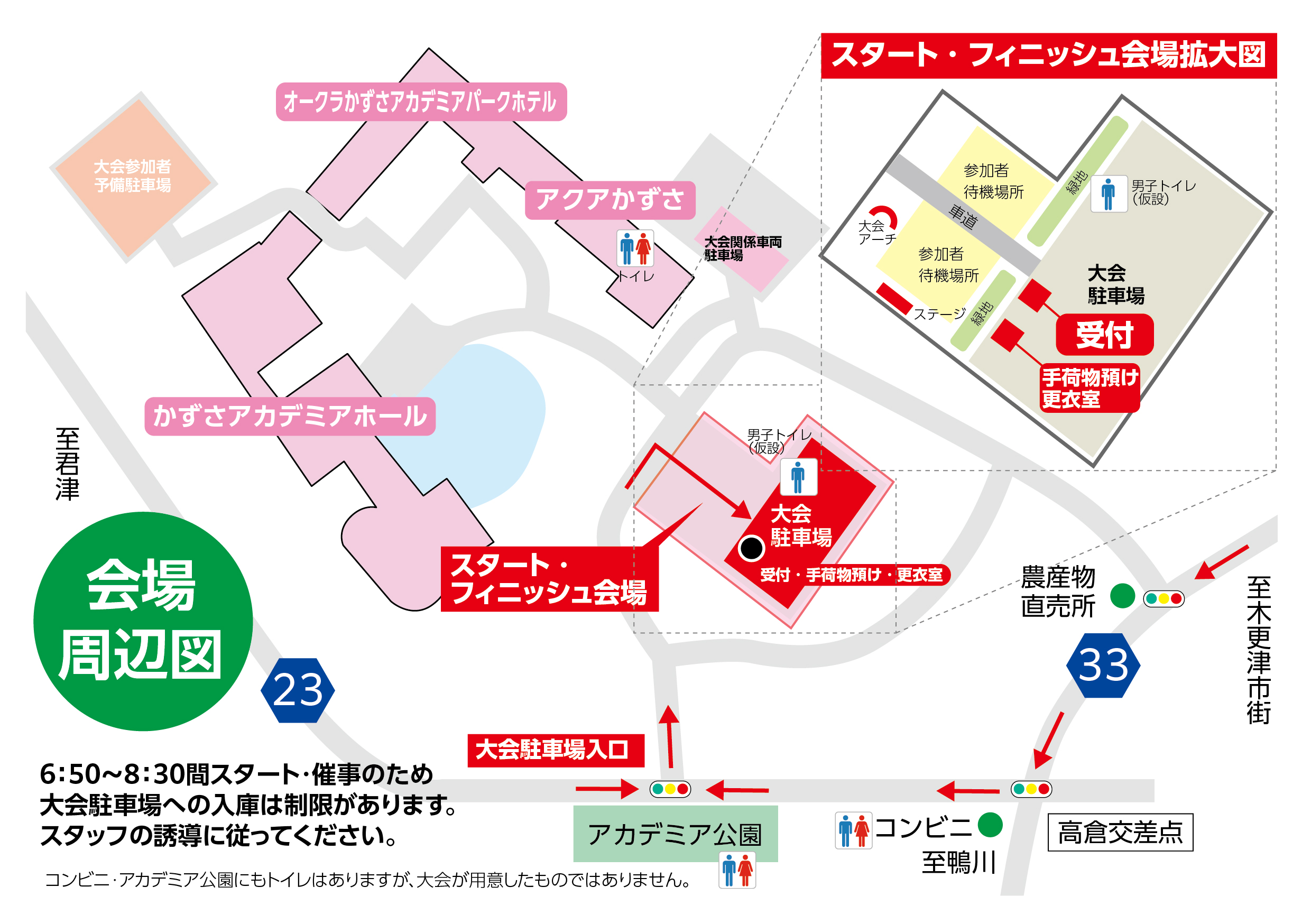 トイレをご利用の際アクアかずさの移動は自転車を降りて移動してください。駐車場へ入る車や大会関係車両が通行します。十分注意して通行してください。駐車場内の自転車の管理は各自でお願いします。駐車場内で起きた盗難・事故につきましては主催者として一切責任を負いません。